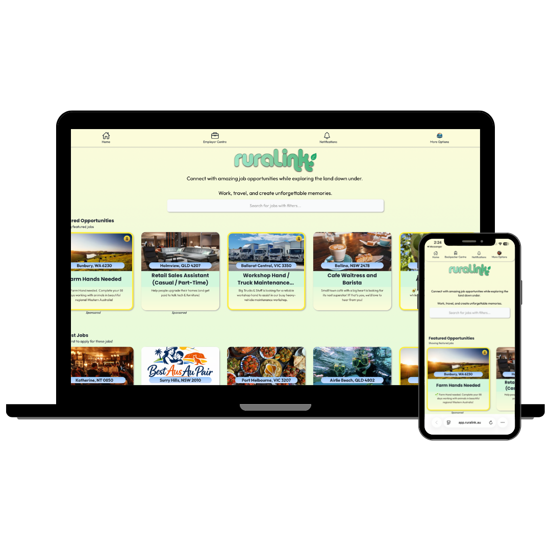 RuraLink is a simple, reliable platform that connects backpackers and temporary workers with genuine job opportunities across regional and metro Australia. Whether you’re chasing 88-day farm work, looking for seasonal jobs, or needing trusted staff for your business, RuraLink brings everything together in one easy-to-use platform.